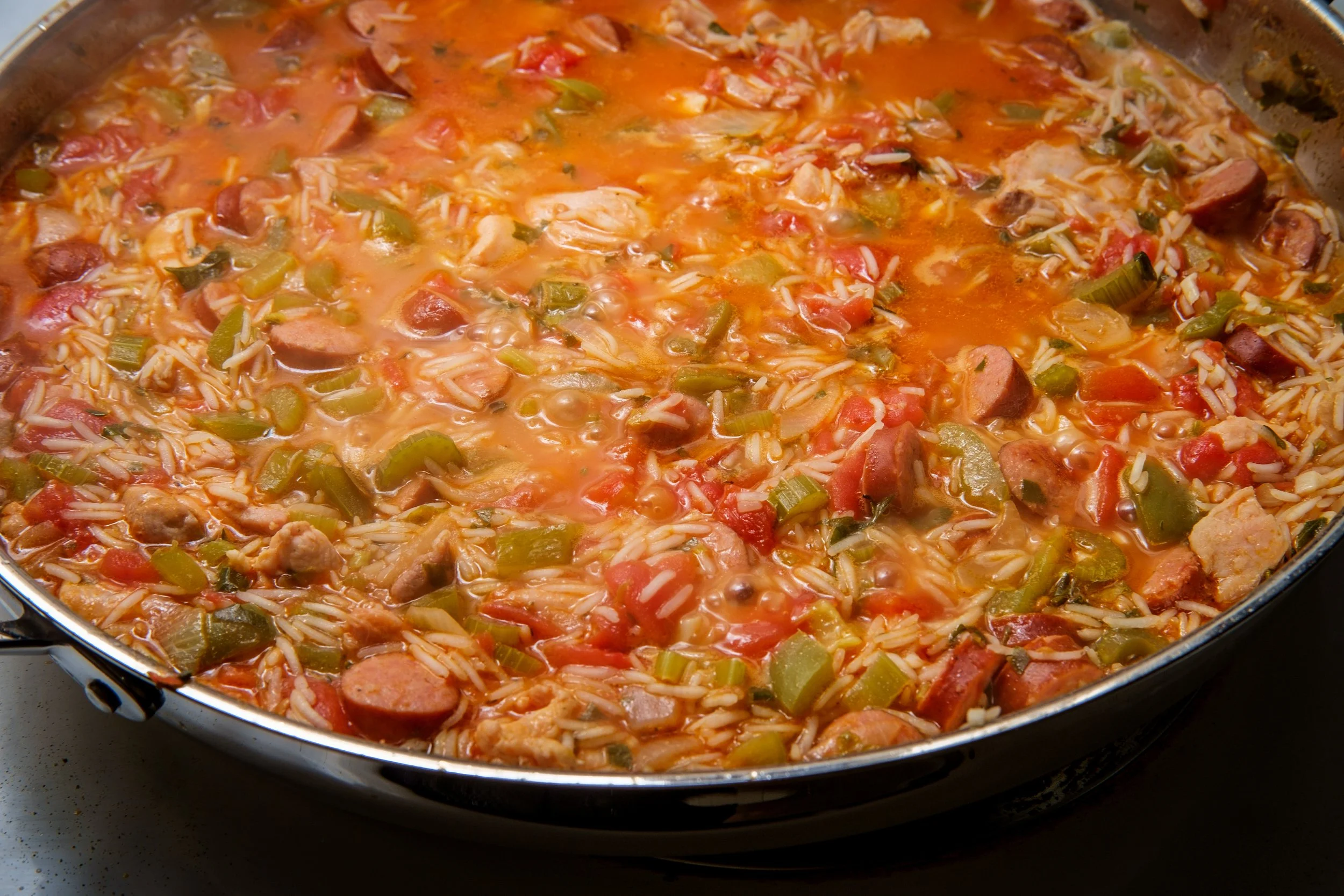 Sausage, chicken, fish, shrimp, and optional seasonal veggies like butternut squash or pumpkin
